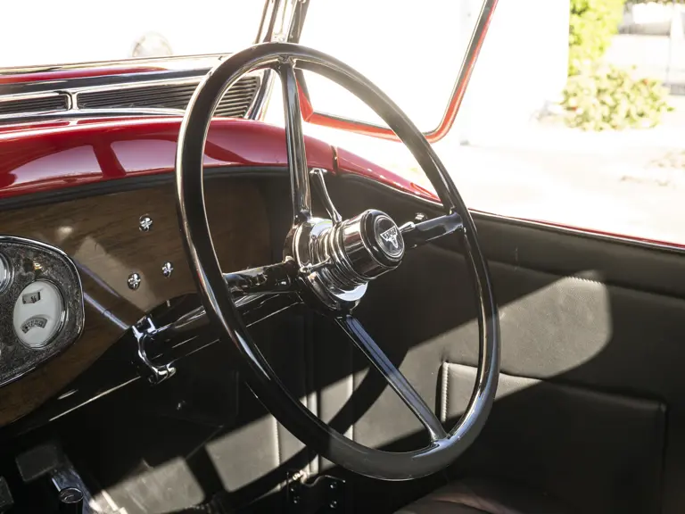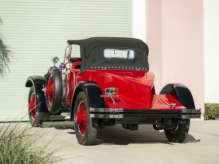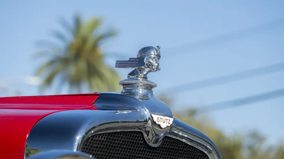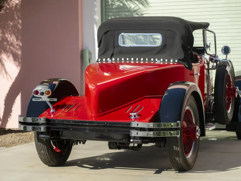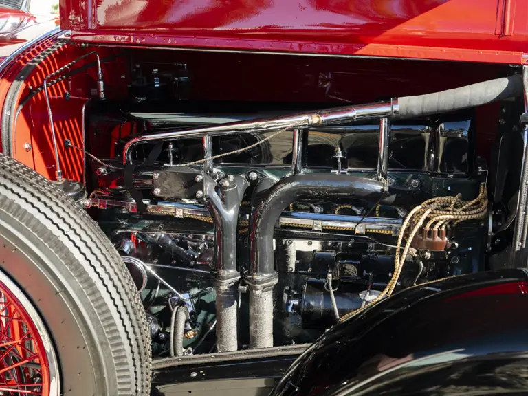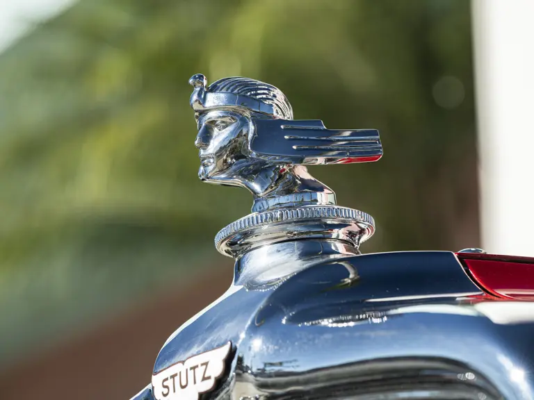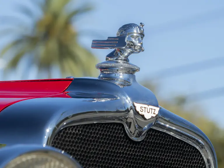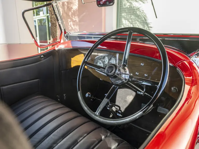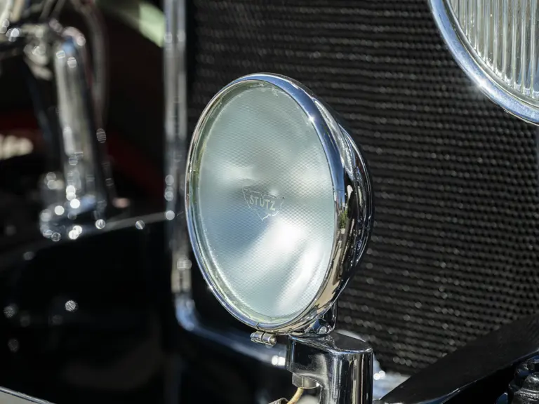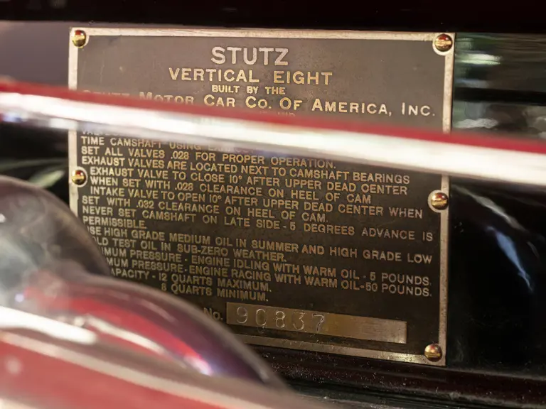 The 1928 model BB offered here was restored in the image of one of those famed models, by this time carrying Millspaugh & Irish bodywork. Built on an unusual right-hand-drive chassis, originally intended for export, it is finished in a striking combination of rich scarlet with black fenders, with some unusual but attractive detailing including a chrome cowl band and additional chrome “flashes” alongside the tail in the rear. It is believed that much of the present cosmetic restoration was performed by the well-known Stutz specialist firm Old Iron Works of Montgomery, Texas.