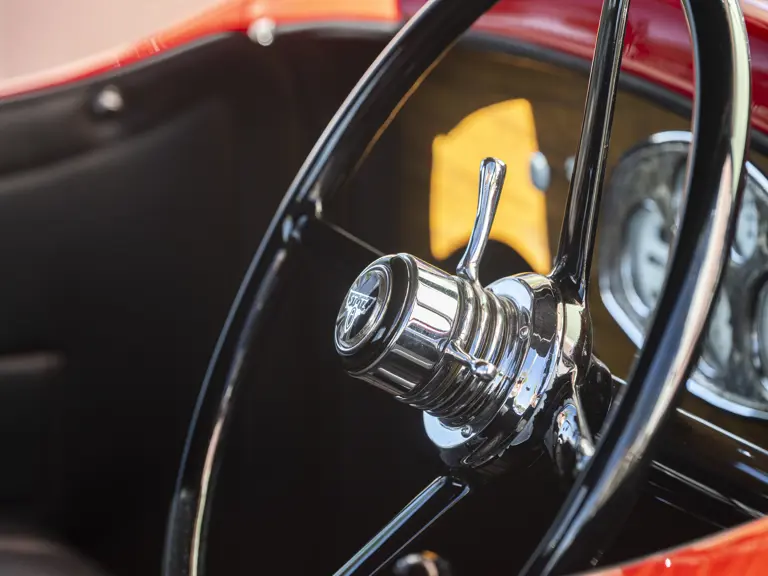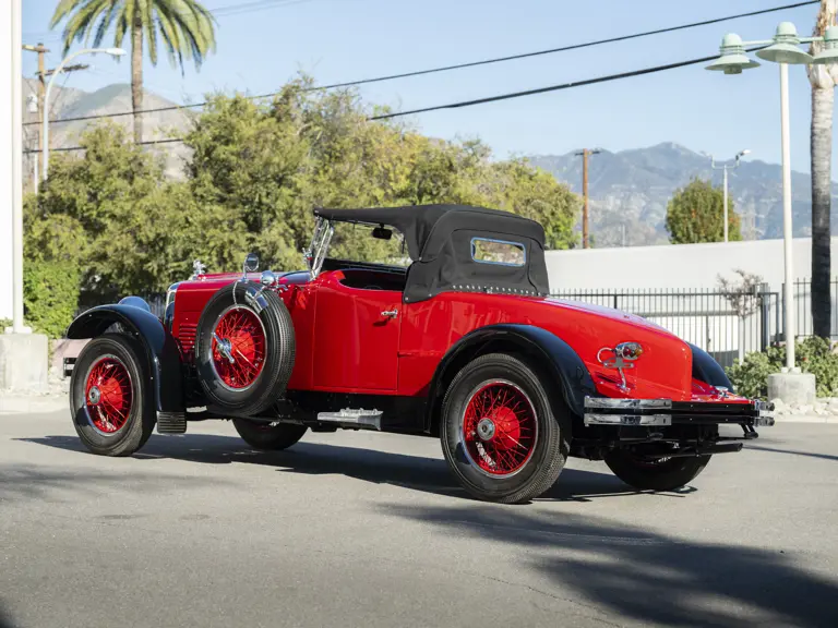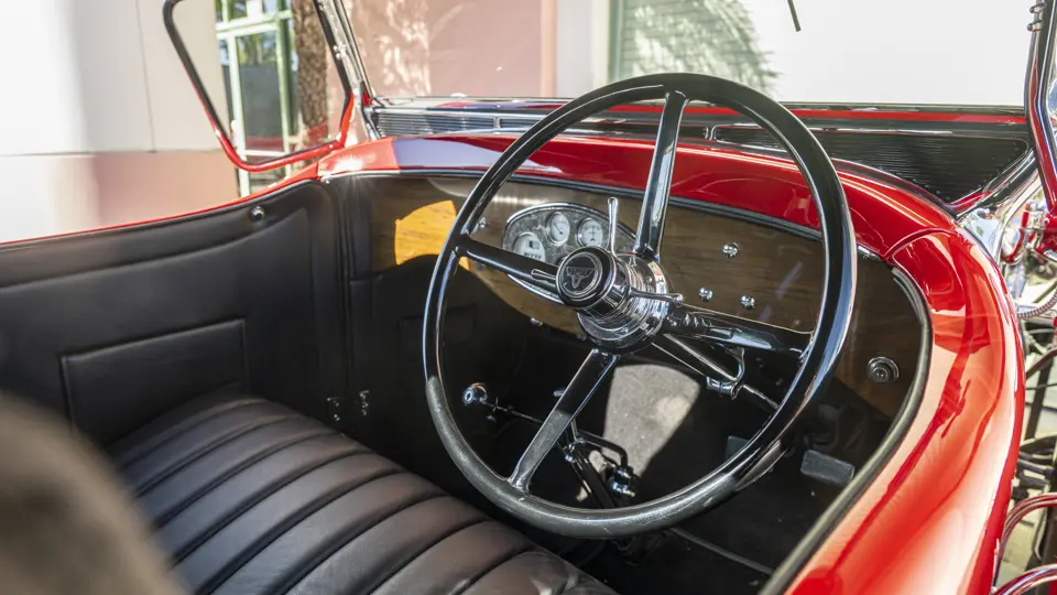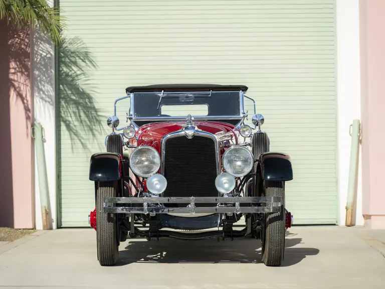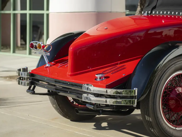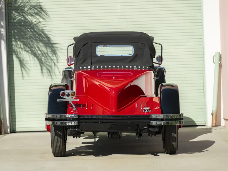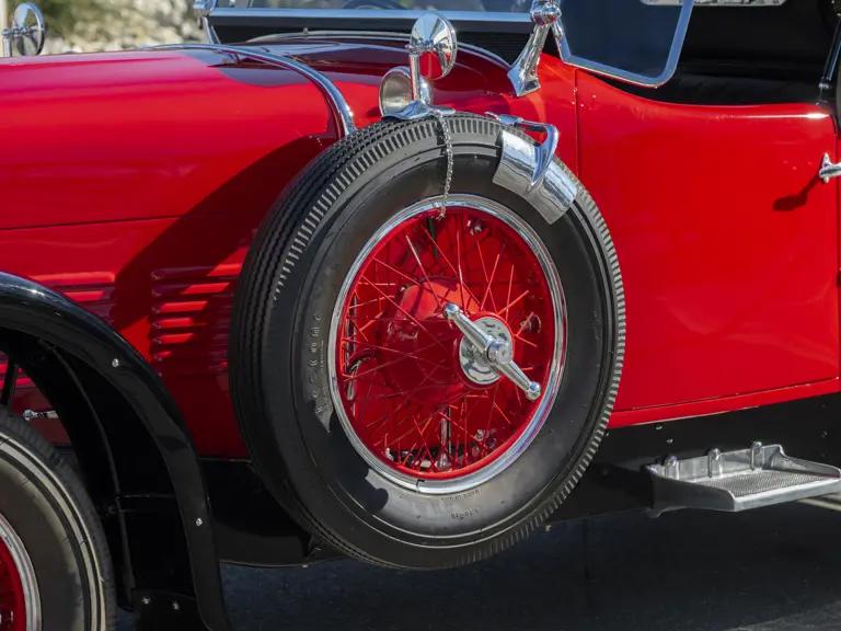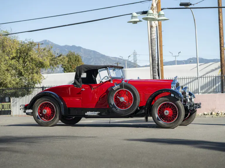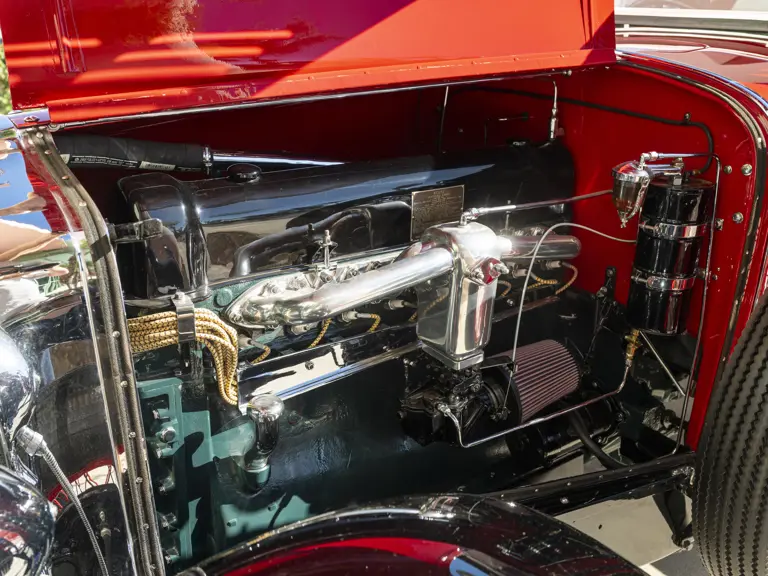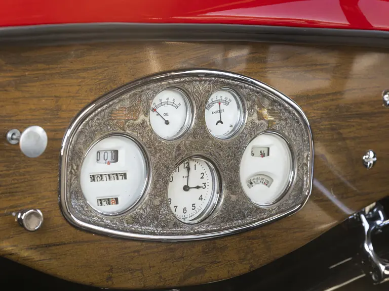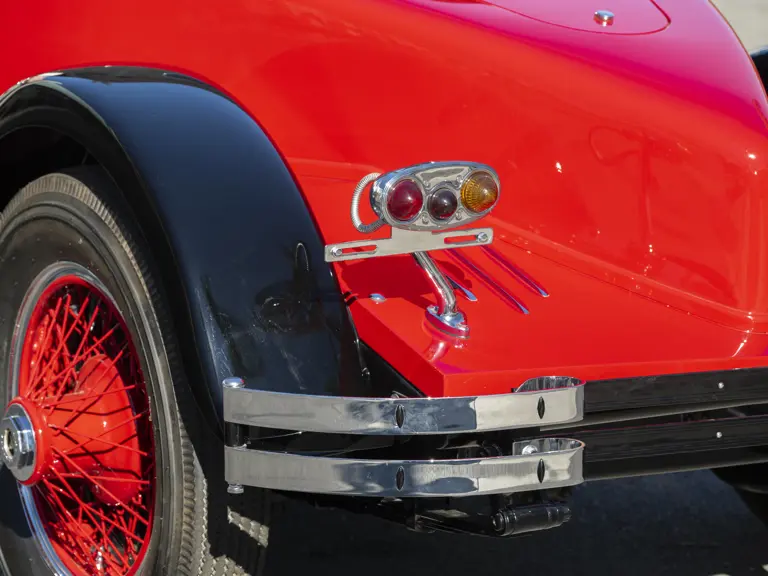 The 1928 model BB offered here was restored in the image of one of those famed models, by this time carrying Millspaugh & Irish bodywork. Built on an unusual right-hand-drive chassis, originally intended for export, it is finished in a striking combination of rich scarlet with black fenders, with some unusual but attractive detailing including a chrome cowl band and additional chrome “flashes” alongside the tail in the rear. It is believed that much of the present cosmetic restoration was performed by the well-known Stutz specialist firm Old Iron Works of Montgomery, Texas.