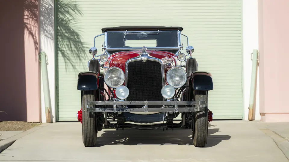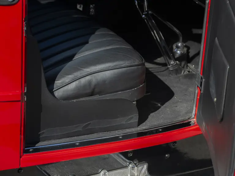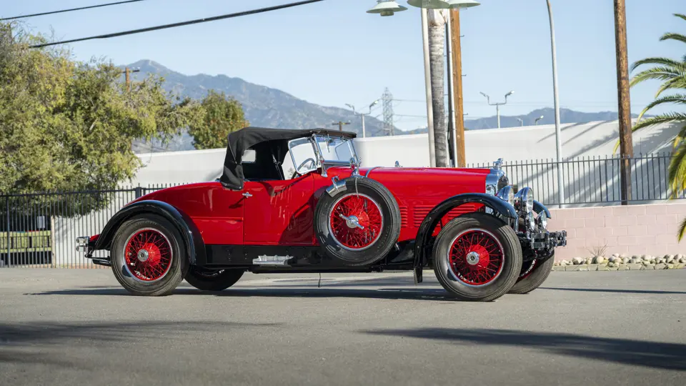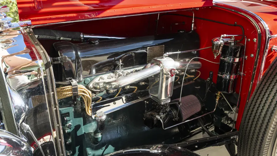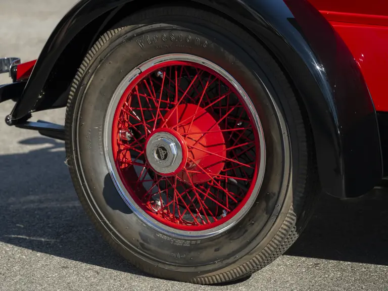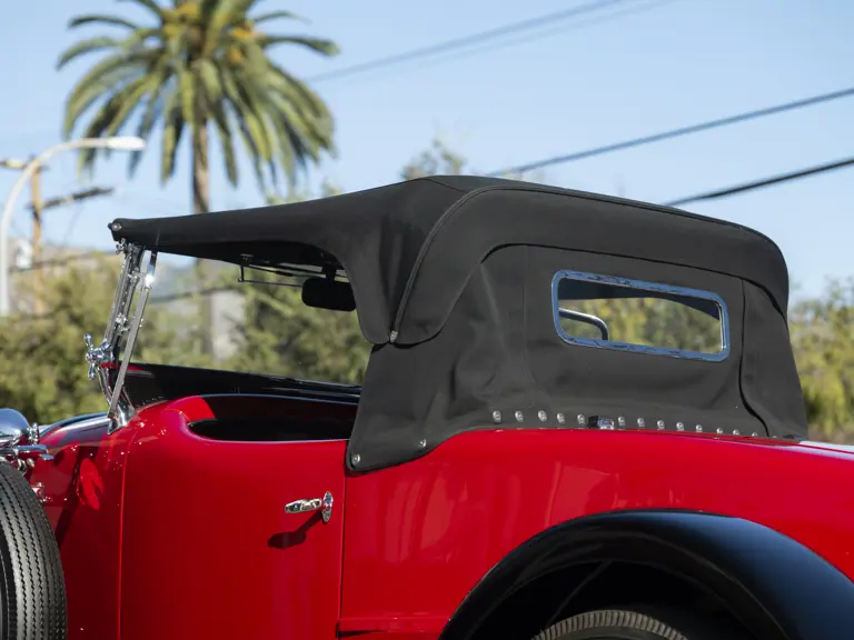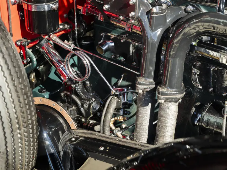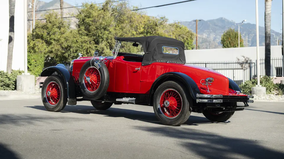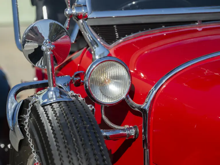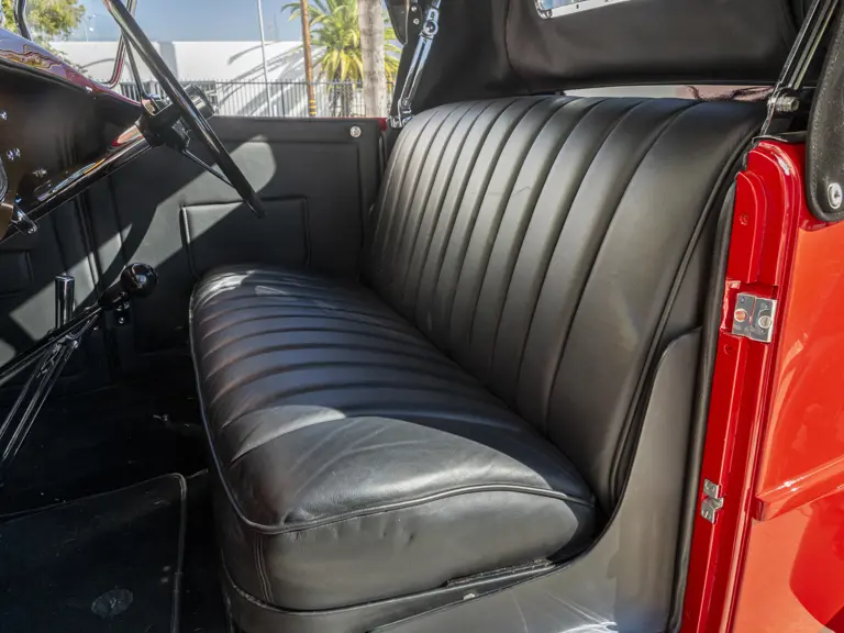 The 1928 model BB offered here was restored in the image of one of those famed models, by this time carrying Millspaugh & Irish bodywork. Built on an unusual right-hand-drive chassis, originally intended for export, it is finished in a striking combination of rich scarlet with black fenders, with some unusual but attractive detailing including a chrome cowl band and additional chrome “flashes” alongside the tail in the rear. It is believed that much of the present cosmetic restoration was performed by the well-known Stutz specialist firm Old Iron Works of Montgomery, Texas.