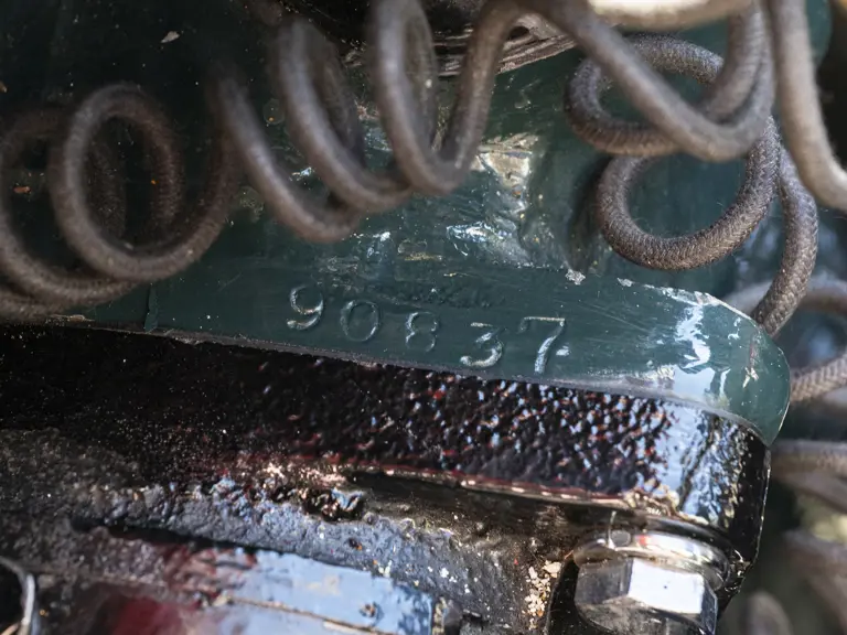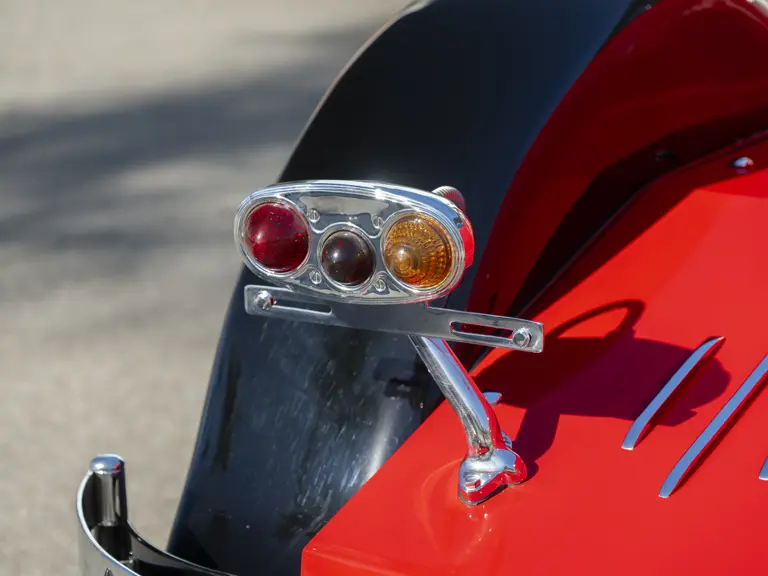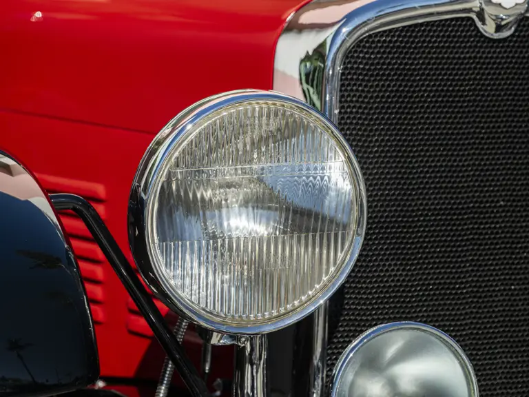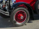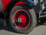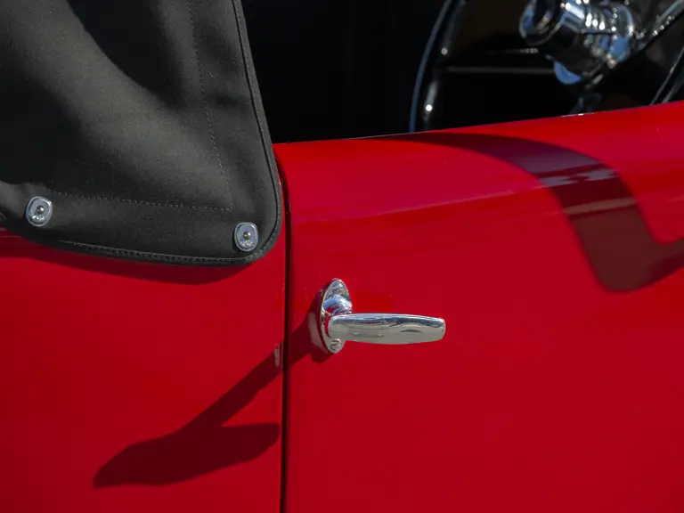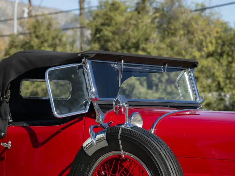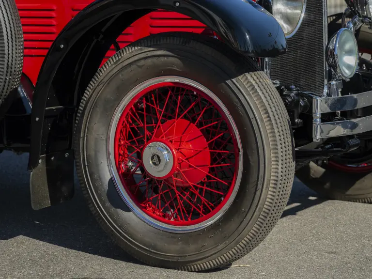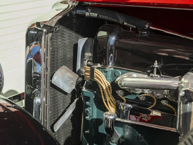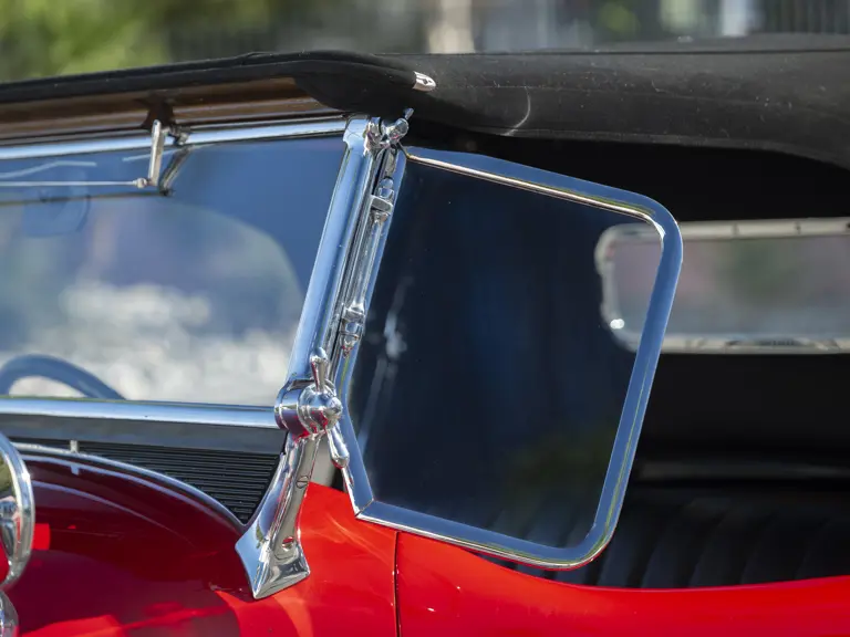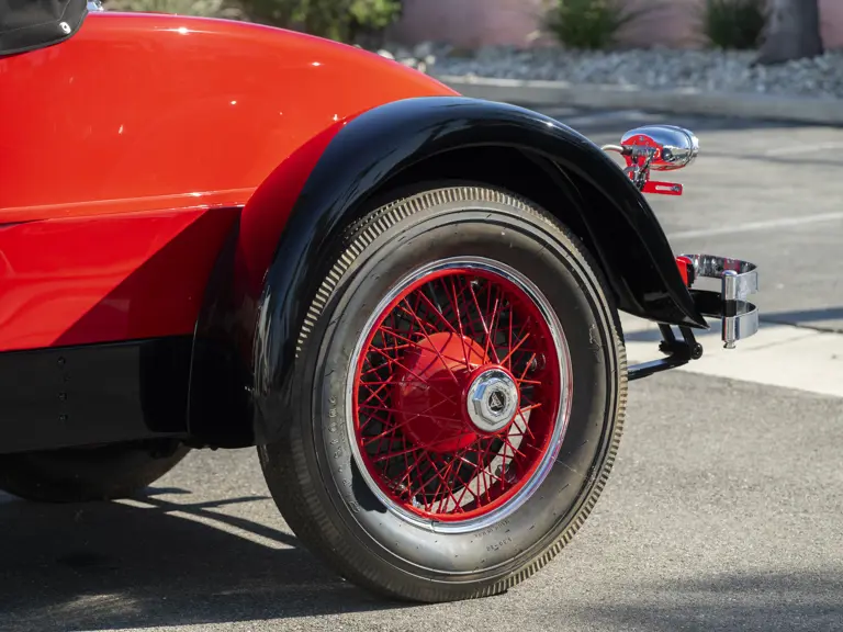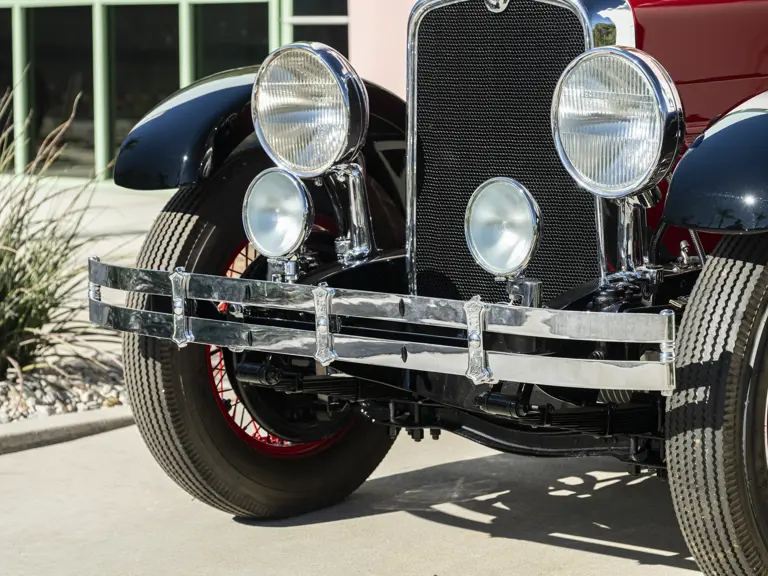 The 1928 model BB offered here was restored in the image of one of those famed models, by this time carrying Millspaugh & Irish bodywork. Built on an unusual right-hand-drive chassis, originally intended for export, it is finished in a striking combination of rich scarlet with black fenders, with some unusual but attractive detailing including a chrome cowl band and additional chrome “flashes” alongside the tail in the rear. It is believed that much of the present cosmetic restoration was performed by the well-known Stutz specialist firm Old Iron Works of Montgomery, Texas.