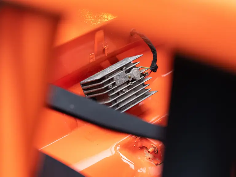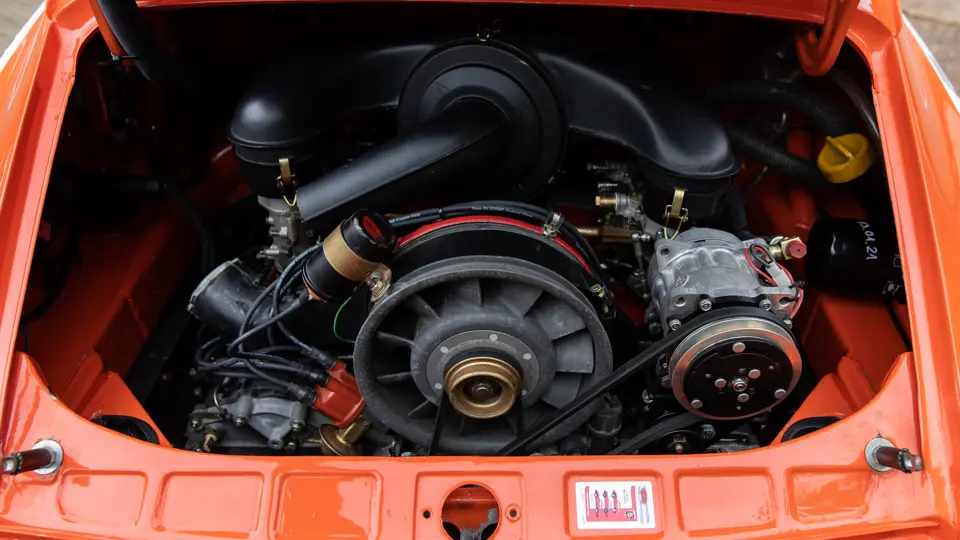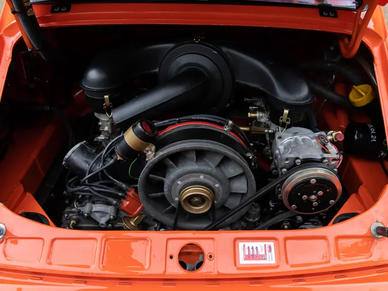 Mechanically, the suspension received specially modified elements, which allow for a ride-height 12 centimetres above the stock setting. Dampening is controlled via shock absorbers made from thicker tubes and longer travel to handle uneven surfaces with greater compliance. The modified, rear-mounted, flat-six, 2.7-litre engine breaths through custom Weber carburettors and feeds power through a special aluminium racing clutch to a type 915 manual gearbox. A front-mounted oil cooler aides in the maintenance of operating temperature. In June 2020, the engine was rebuilt and invoices on file reveal the sum of CHF 24,949 to complete the project.