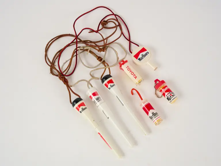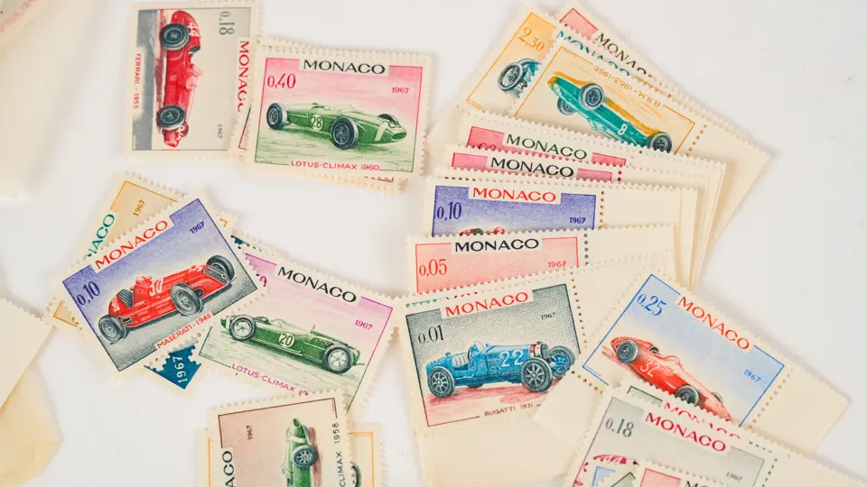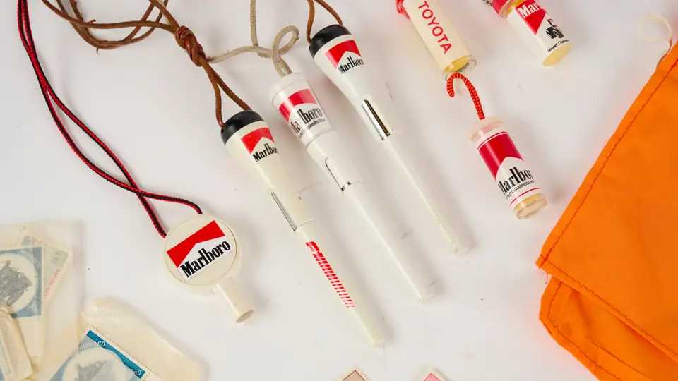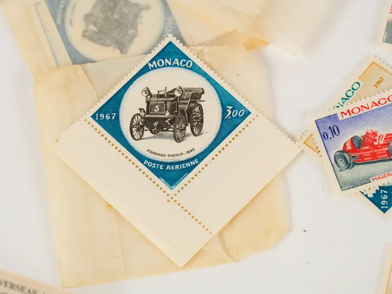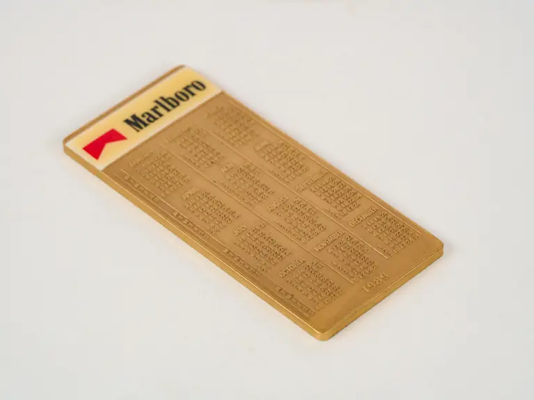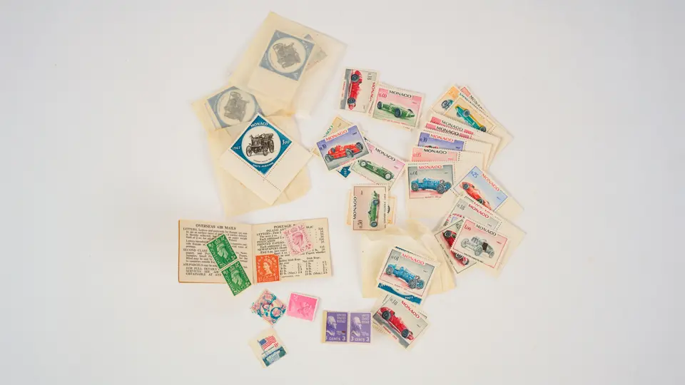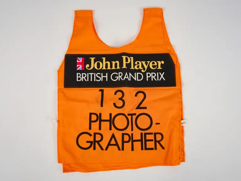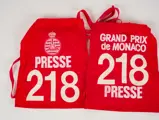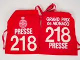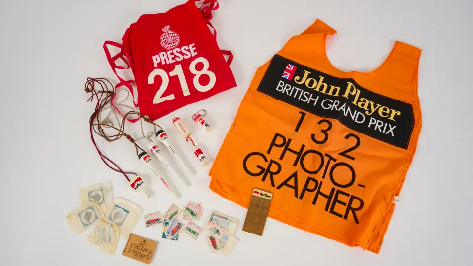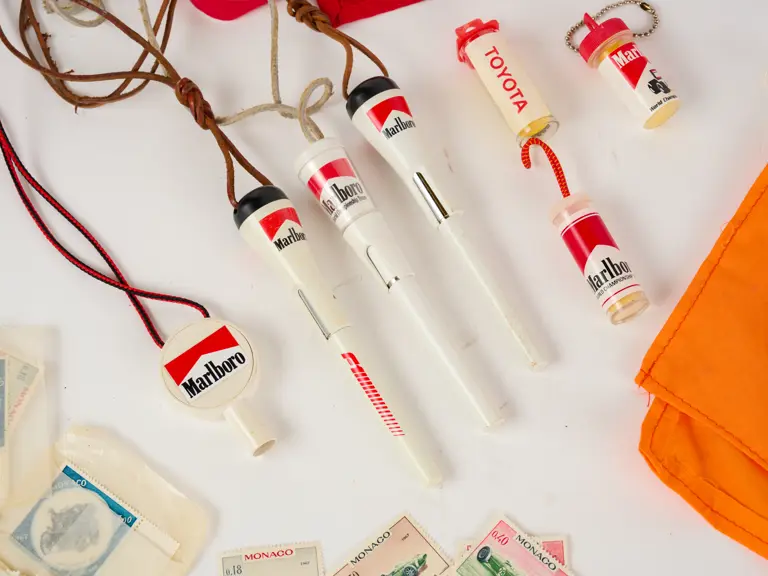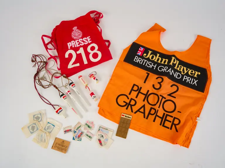 This lot contains a variety of items given or used by Rob Walker at Formula 1 Grand Prix. It includes, a Monaco Grand Prix Press Bib, a British Grand Prix Photographer Bib, three Malboro Pens and Ear Plugs, a Metal 1989 Calender, and Monaco Stamps from 1967.